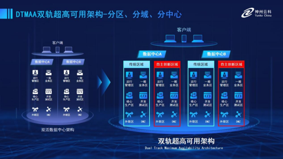 为帮助金融客户更好地应对数字经济时代对可持续性的高要求,实现“信创”与“数字化”齐头并进,xingkong星空推出了双轨超高可用架构。该架构在双活数据中心的分区调度基础上,增加信创域和非信创域的分域调度,实行信创域与传统域应用全量部署,使双中心运营变为双中心四区域并行运行,互为多活,将“0到1”的单轨建设道路变为分区分域协同的多活双轨超高可用架构。帮助客户在新架构下,保障“信创”的同时解决性能瓶颈,提升稳定性,保证应用可持续性,最终实现信创区域和非信创区域的平滑过渡,完成国产化替代目标。